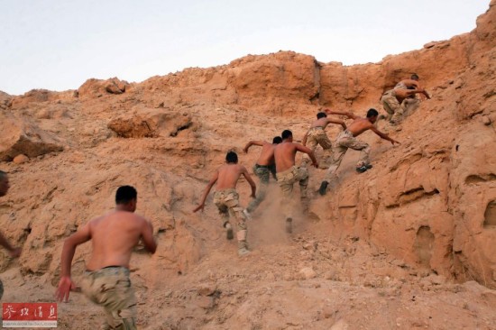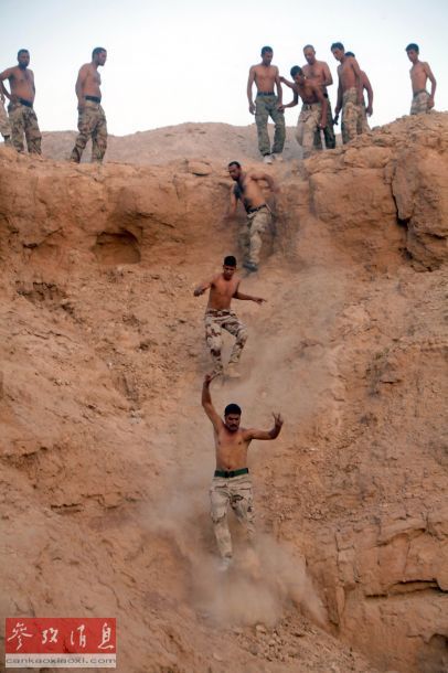 2014年9月25日,伊拉克克巴拉和纳贾夫之间的沙漠地带,加入伊拉克军队的什叶派士兵正在进行野外训练,以对抗“伊斯兰国”激进分子。报道称,9月1日,伊安全部队、库尔德武装和什叶派民兵在伊拉克和美国空军的支援下,打破“伊斯兰国”极端武装对北部阿迈尔利镇长达两个多月的围困,成功攻入这座被“伊斯兰国”极端武装围困两个多月的城镇。