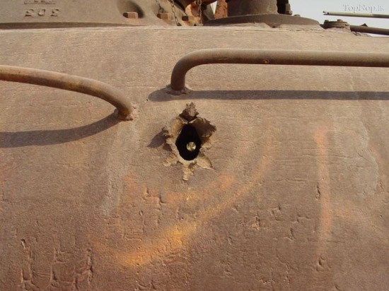坦克炮塔上的弹孔清晰可见,似乎整个炮塔被脱壳穿甲弹打了个对穿。