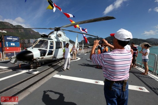 6月16日,在塞舌尔维多利亚港,民众在哈尔滨舰上和舰载直升机合影留念。此次应塞舌尔政府邀请,中国海军护航编队将派出由65名官兵组成的受阅方队,参加塞舌尔国庆阅兵。这是中国海军徒步方队首次在国外参加阅兵任务。俄罗斯、法国、印度等国家的军队也将参加这次阅兵活动。新华社记者饶饶摄