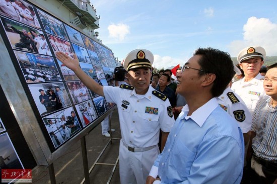 6月16日,在塞舌尔维多利亚港,第十四批护航编队指挥员袁誉柏少将向前来欢迎的民众介绍编队的相关情况。新华社记者饶饶摄