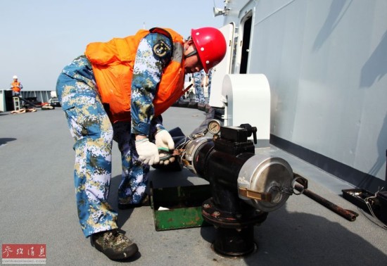 9月2日,井冈山舰官兵牵引太湖舰的输油管。新华社记者梁舜摄