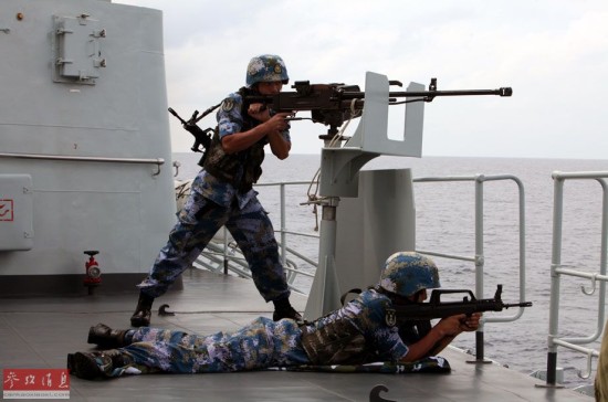 3月21日,在亚丁湾东部海域发现多艘可疑小目标后,哈尔滨舰上特战队员进入实弹部署,随时待命。当地时间3月21日12时40分,中国海军第十四批护航编队在亚丁湾东部海域执行护航任务时发现18艘可疑小目标。编队进入二级反海盗部署,直升机升空并协助快艇进行查证驱敌。期间,有多艘小目标试图高速接近商船,被特战队成功驱离。14点18分,护航编队伴随商船驶离危险区域。新华社记者饶饶摄