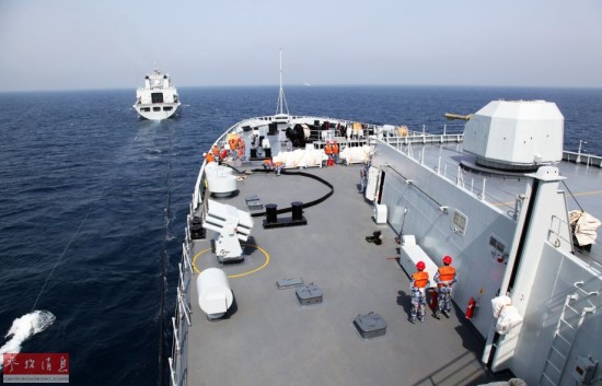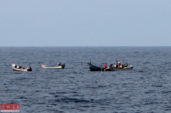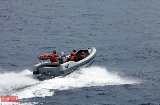 3月21日,在亚丁湾东部海域发现多艘可疑小目标后,特战队员驾驶小艇迅速驶向受威胁商船。新华社记者饶饶摄