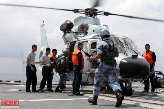 3月21日,在亚丁湾东部海域发现多艘可疑小目标后,特战队员搭乘直升机准备执行任务。新华社记者饶饶摄