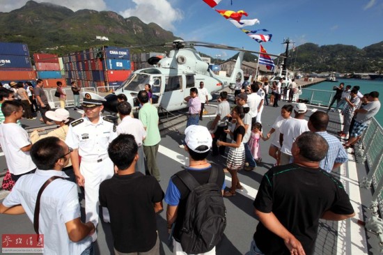 6月16日,在塞舌尔维多利亚港,当地民众和华人华侨在哈尔滨舰上参观。新华社记者饶饶摄