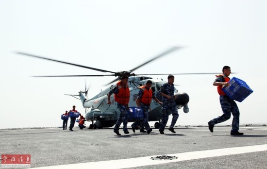 9月2日,太湖舰官兵往直升机上搬运干货。当地时间9月2日上午10时左右,中国海军第十五批护航编队“井冈山号”两栖登陆舰与“太湖号”综合补给舰进行了立体补给。在补给中,太湖舰不仅通过纵向补给方式给井冈山舰进行了300吨柴油补给,同时还通过直升机向井冈山舰进行了干货补给,转运新鲜蔬菜30多箱件,为执行护航任务提供了有力的后勤保障。新华社发(李秀林摄)