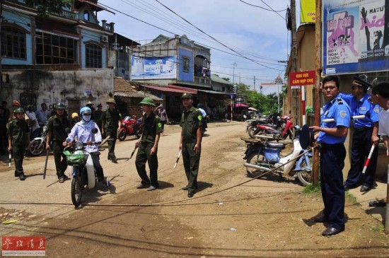 7月7日,在越南首都河内西部的石七县附近,安全人员在坠机事故现场附近警戒。新华社记者章建华摄