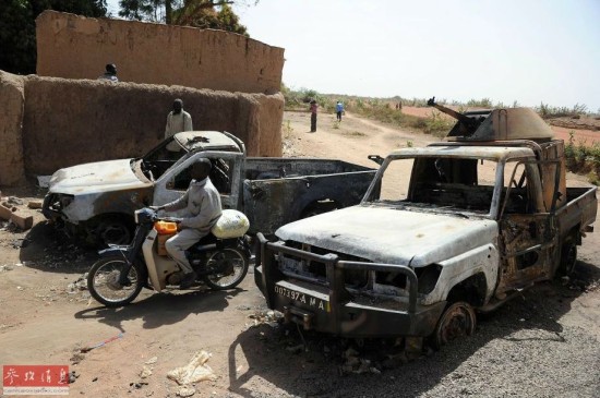 2月3日,在马里贾巴利,一名男子骑着摩托车从两辆被烧毁的汽车旁经过。新华社/法新