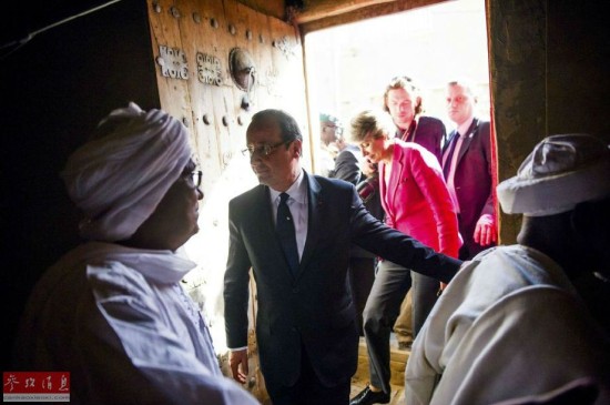 2月2日,法国总统奥朗德飞赴马里,慰问在马里作战的法军士兵。图为当日,奥朗德(中)在马里古城通布图参观大清真寺。新华社/路透