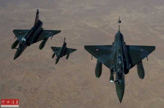 1月12日,马里军方消息称,法国军队在对马里北部重镇科纳发动的空袭中打死了100多名武装分子。连日来,马里政府军与马里北部武装分子在距离首都巴马科东北约600公里的重镇科纳发生激烈交火,随后马里过渡总统特拉奥雷紧急致函联合国秘书长和法国总统请求援助。法国总统奥朗德11日宣布法国于当天下午出兵,向马里政府军提供支持。这张法国军方1月12日公布的照片显示,三架法国幻影2000D战斗机从乍得首都恩贾梅纳上空飞过。新华社/路透