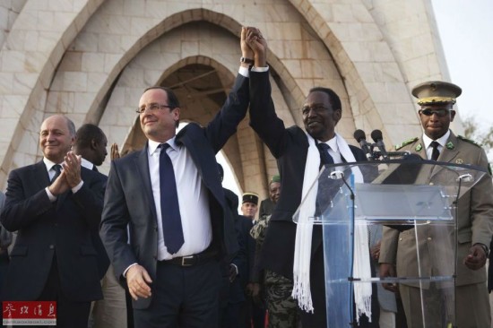 2月2日,法国总统奥朗德对马里进行了短暂访问,先后在马里北部重镇通布图和马里首都巴马科发表讲话,称法国军队不会在马里长期滞留,来自非洲国家的部队将担负帮助马里维护国家统一的使命。图为当日,在马里首都巴马科,奥朗德(前左)和马里过渡总统特拉奥雷(前右)一同携手致意。新华社/路透