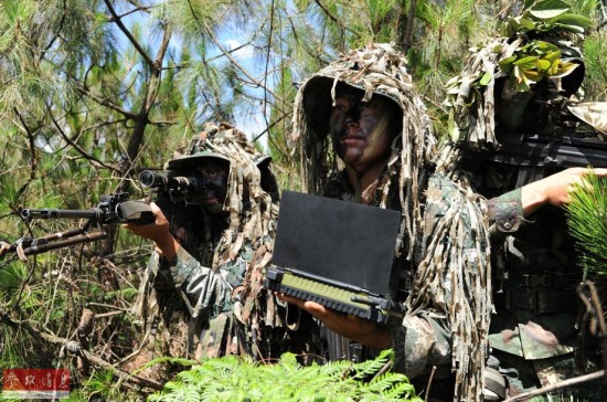 潜入“敌”后的狙击小组利用信息化装备向指挥部传递战场情况(5月21日摄)。
