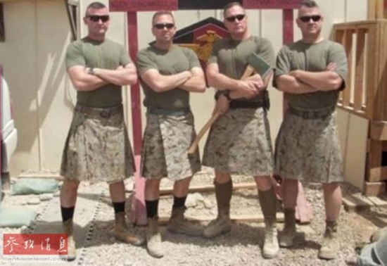 图为在伊拉克和阿富汗执行任务的美军士兵贴出穿短裙作战服照片。(英国《泰晤士报》网站)