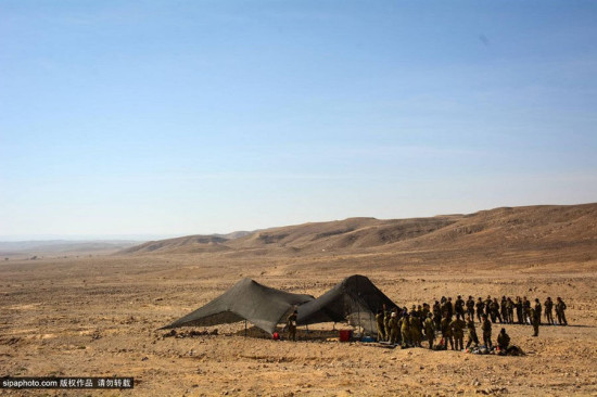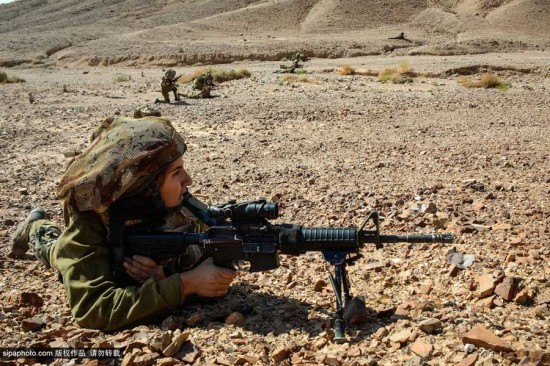 图为当地时间2014年11月,以色列内盖夫沙漠,摄影师拍摄了一组IDF情报队女兵训练时的照片,在沙漠里,每位女兵都扛枪“作战”,英姿飒爽不输男儿。