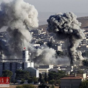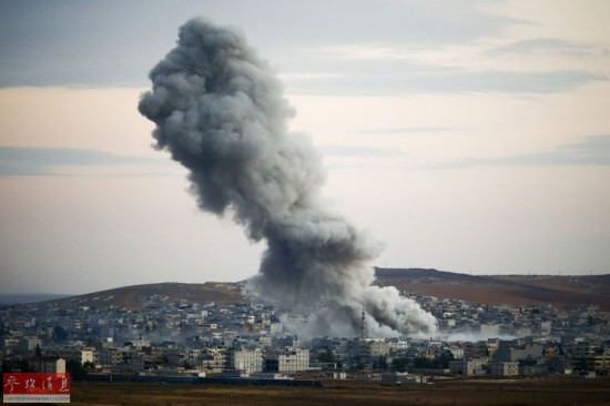 资料图片:在叙土边境重镇艾因阿拉伯,美军战机对“伊斯兰国”武装进行空中打击后浓烟升起。