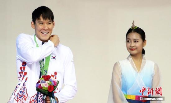 2014年9月22日,仁川亚运会游泳比赛在文鹤朴泰桓游泳馆展开第二日争夺,朴泰桓率领韩国队夺得男子4X200米自由泳接力铜牌。颁奖典礼上,魅力十足的朴泰桓引来礼仪小姐崇拜的目光。中新社记者 汤彦俊 摄