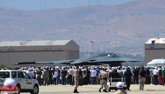 7月17日,加利福尼亚帕姆代尔飞机组装基地,民众围观一架B-2隐形轰炸机。