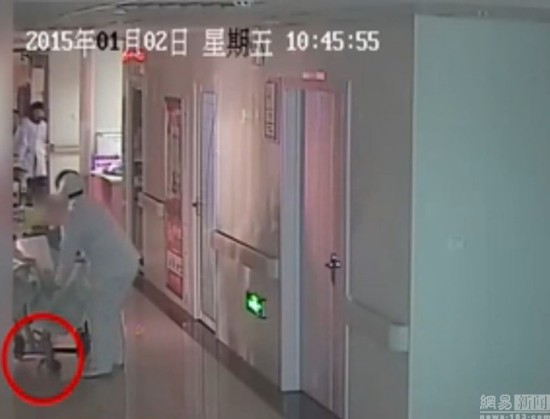 2015年1月2日上午11时,河南洛阳,刚刚当上父亲还不到半个小时的潘自强(化名)被医生告知,刚生下来的孩子情况不好,脑袋左侧肿大,左眼睁不开,怀疑有颅内血肿,建议放弃治疗,潘自强含泪同意。大约一个小时后,潘自强见到了爱人,爱人告诉他:孩子是在她被医生用轮椅推去产房的途中,在走廊里生下的。孩子生下来后就掉在了地上,被脐带倒悬着,小脑袋擦着冰凉的地面,晃来晃去。而医护人员推着轮椅又走了十几米。图为监控视频。