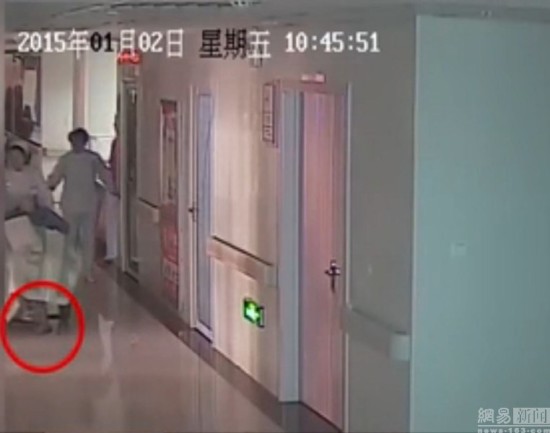 大约一个小时后,秦大夫带着设备来到观察室,要在病床上给尚彩晴做B超,并坚持要她做剖腹产。尚彩晴说,当时她大声嘶喊着“忍不住了,快送我进产房”,随后,有医务人员推来一张轮椅,尚彩晴被抱了上去。刚被推出病房,孩子就在轮椅上出生了。图为监控视频画面