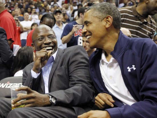 2012年6月16日,在巴西和美国进行的一场篮球比赛赛场,奥巴马和勒夫开起了玩笑。