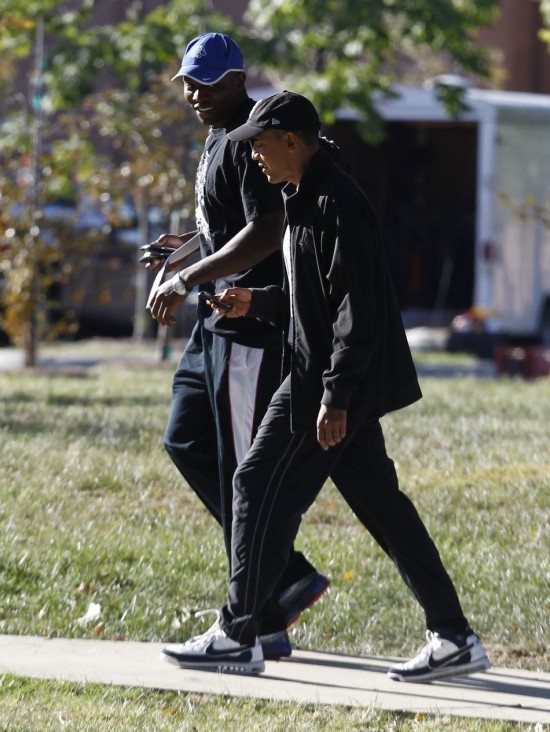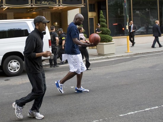 2009年9月21日,纽约圣巴塞罗谬教堂,奥巴马和勒夫穿过街道准备去打篮球。