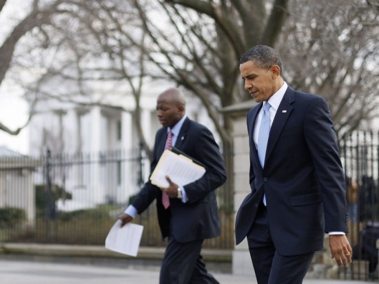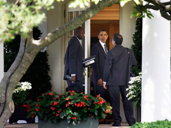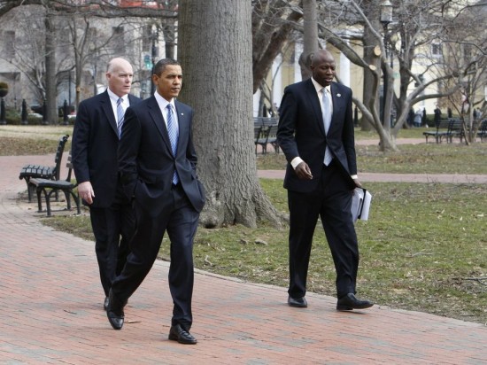 2010年3月1日,华盛顿,在一次商会演讲结束后,奥巴马在勒夫及一位特工陪同下返回白宫。