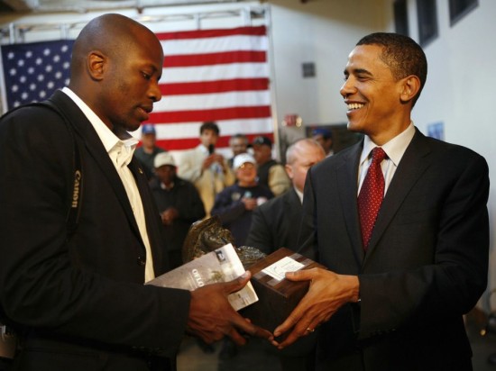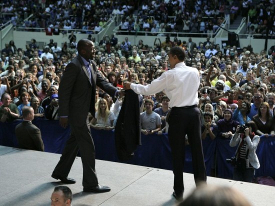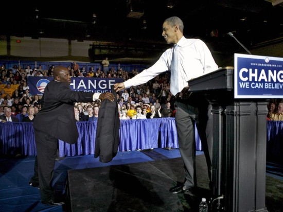 2008年5月2日,在夏洛特市的竞选集会上,奥巴马将上衣递给勒夫。