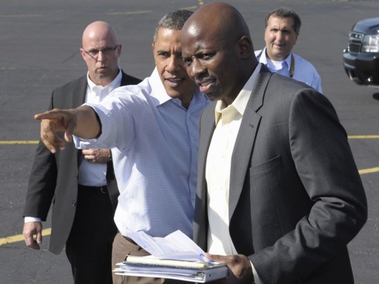 2011年10月17日,在马阿什维尔地区机场,奥巴和勒夫正在交谈。当时他正在为其《美国就业法案》东奔西忙。
