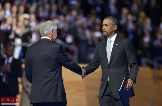 1月28日,在美国首都华盛顿附近的迈尔·亨德森军事基地,美国总统奥巴马(左)在欢送仪式上和国防部长哈格尔错身而过。当日,奥巴马举行仪式欢送即将离任的国防部长哈格尔。奥巴马去年底接受哈格尔的辞呈,并提名美国防部前常务副部长阿什顿·卡特为新一任国防部长。如果提名获得参议院批准,卡特将成为继盖茨、帕内塔以及哈格尔之后奥巴马任期内的第四位防长。新华社记者 殷博古 摄