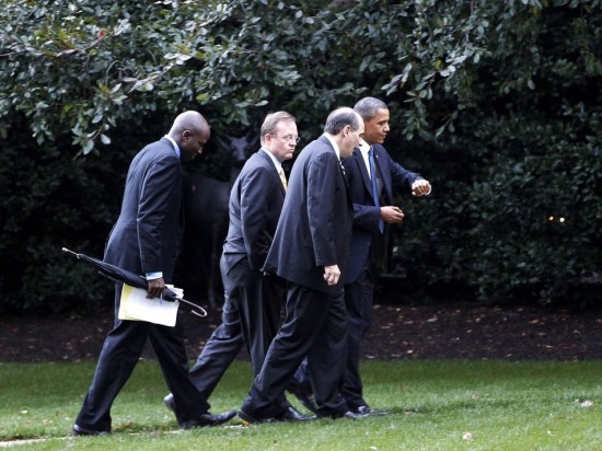 2010年10月27日,在参加完一档脱口秀节目后,奥巴马和他的高级顾问大卫·阿克塞尔罗德、新闻秘书罗伯特·吉布斯以及勒夫一起返回白宫。