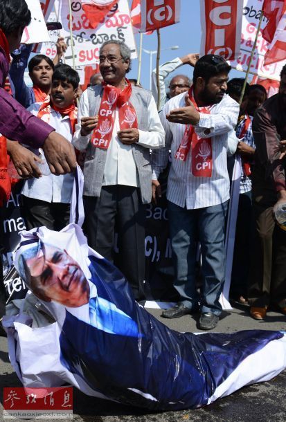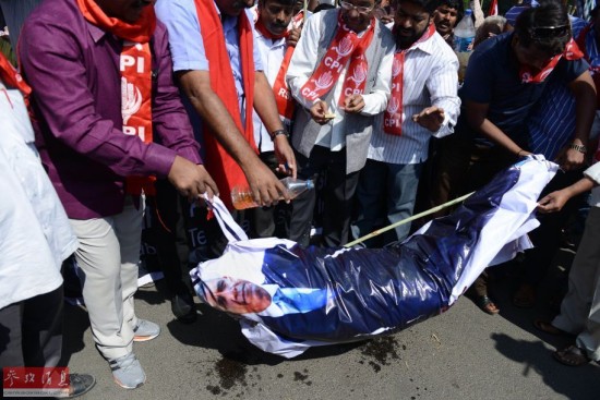 当地时间2015年1月24日,印度海德拉巴,印度共产主义活动家举行示威,抗议美国总统奥巴马将出访印度。