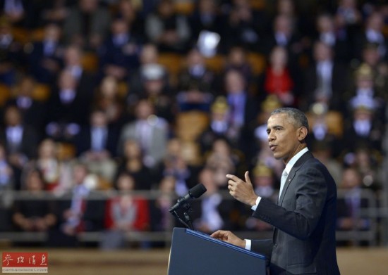 1月28日,在美国首都华盛顿附近的迈尔·亨德森军事基地,美国总统奥巴马在欢送国防部长哈格尔的仪式上讲话。当日,奥巴马举行仪式欢送即将离任的国防部长哈格尔。奥巴马去年底接受哈格尔的辞呈,并提名美国防部前常务副部长阿什顿·卡特为新一任国防部长。如果提名获得参议院批准,卡特将成为继盖茨、帕内塔以及哈格尔之后奥巴马任期内的第四位防长。新华社记者 殷博古 摄