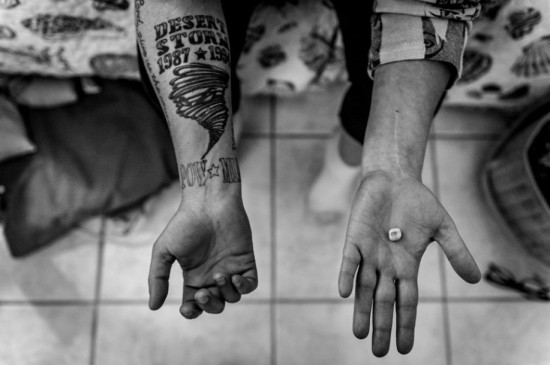 福斯手拿她因夜里磨牙而掉落的一颗臼齿。她手上还留有在一次创伤后应激障碍病发时用拳头击打一面窗户而留下的疤痕。