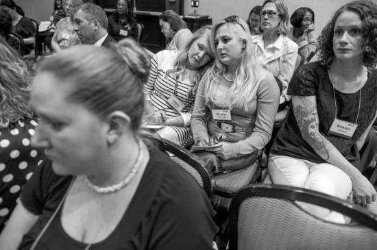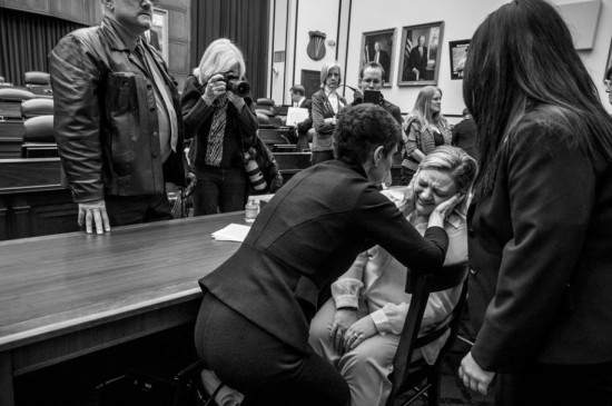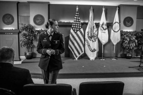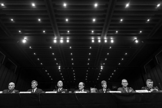 卡尔弗特从2013年9月开始环游美国,记录军中性侵害幸存者。她们无处不在,存在于军队的每个部门。她们的故事骇人听闻。图为:空军、陆军、海军、海军陆战队及海岸警卫队的军队律师正在一场于国会山举行的参议院军事委员会听证会上作证,讨论军中性侵害问题。