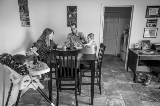 弗吉尼亚州汉普顿,亨弗斯和丈夫斯科特及孩子们在家中进行晚餐前的祷告。针对据亨弗斯说强奸了她的那名男子的案件在审讯快开始前被一名长官销案。亨弗斯说,该长官告诉她,“尽管他表现得不像一位绅士,但也没理由起诉他。”