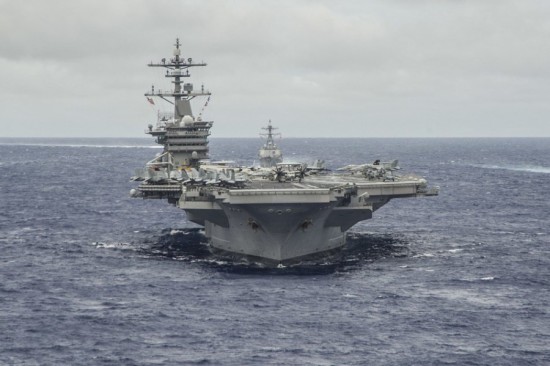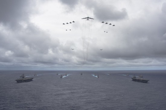 当地时间9月23日,美国海军代号“勇敢之盾”联合军演进入武力展示阶段。参加军演的文森号与华盛顿号两支航母战斗群与驻关岛的B-52H战略轰炸机、F-22A猛禽战机、F-15C鹰式战机、MV-22鱼鹰战机,组成海空大编队,规模庞大。