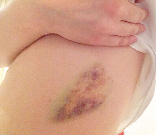 据报道,上周胡汉清宣告已分手两个月,与江希文母女仍同住沙宣道4,000尺胡宅但分房睡,有传江希文出辣招霸占胡宅,要求胡汉清租南区豪宅给两母女住,令外界以为女方金钱至上,江希文左腹半尺长瘀伤相片曝光,令全城哗然,疑被打的江希文开腔接受港媒电话访问,声泪俱下作出大反击,称:“想离开恐怖的环境。”图为女方江希文受伤照。