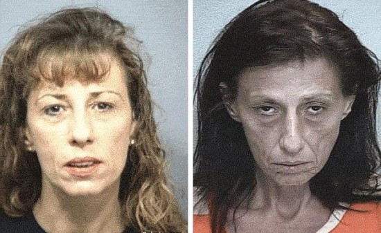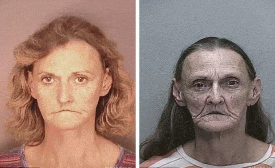 左图是这位女士2009年的照片,右图为她今年被捕入狱时候的照片,她刚31岁,皮肤已经老化的不成样子了。