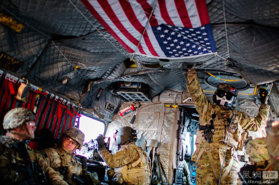 奥巴马曾经做出的于今年年底完全从阿富汗撤军的允诺已经破灭,换之以于今年年底“结束作战任务”。这是一个既在政治上保全脸面,又在军事上进退有据的算盘。当地时间12月21日,阿富汗帕克蒂亚,从第三骑兵团飞往阿富汗国家军队总部的CH-47直升机中的美军士兵看另一架直升机。