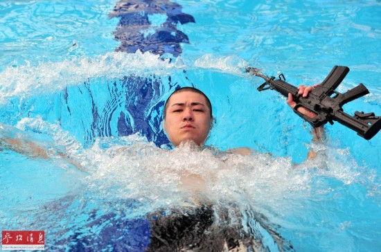 4月8日,在位于韩国东豆川的凯西营营地,美军士兵在2014年“最佳战士”竞赛中做水中生存测试。据报道,美国第二步兵师一年一度的“最佳战士”竞赛在16名士兵中展开。