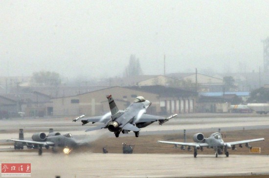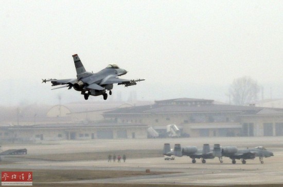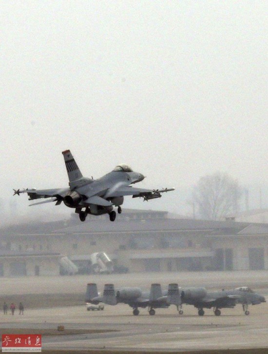 4月2日,一架F-16战斗机(中)在韩国乌山美军基地降落,远处A-10攻击机正准备起飞。