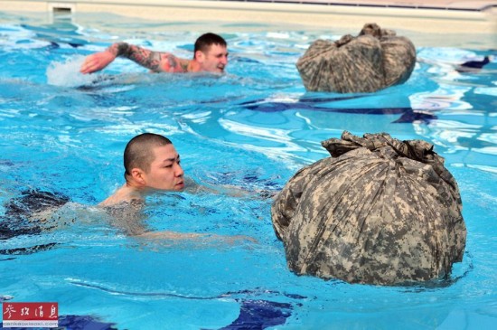 4月8日,在位于韩国东豆川的凯西营营地,一名美军士兵在2014年“最佳战士”竞赛中做水中生存测试。