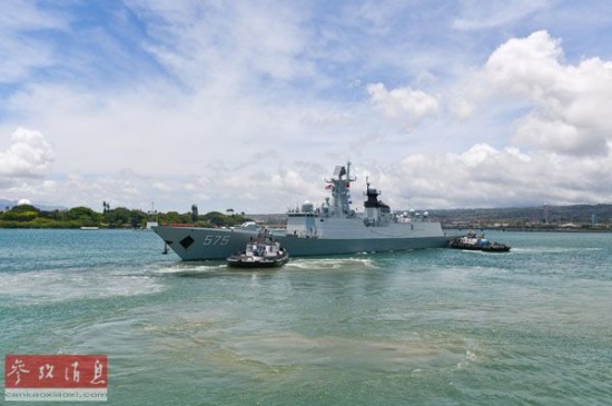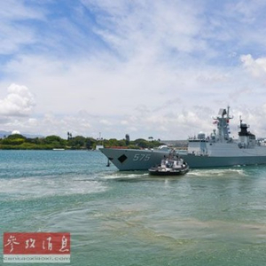 资料图片:2014年7月10日,中国三艘参加“环太平洋-2014”演习舰艇驶离珍珠港码头赴演习海域。7月9日,中国海军导弹护卫舰岳阳舰在拖船拖带下驶离美国夏威夷珍珠港码头。新华社记者覃海石摄