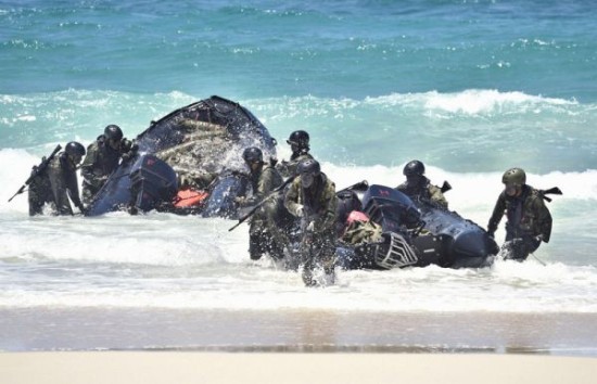 当地时间7月1日,美国夏威夷火奴鲁鲁,参与环太平洋军演的日本陆上自卫队士兵正在演练抢滩登陆。来自22个国家及6个观察员国的大约两万五千名士兵参加了'环太平洋—2014'军事演习。