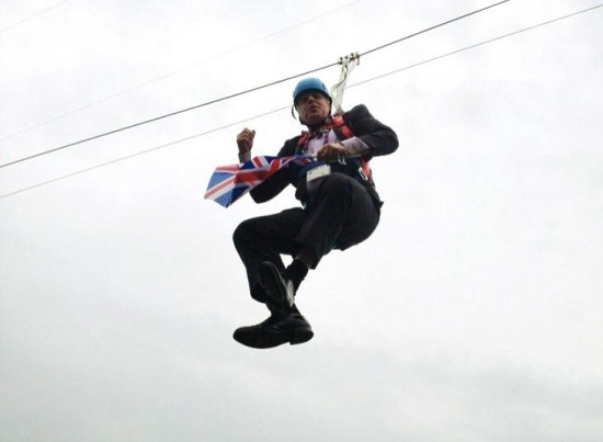 伦敦奥运会期间,由于电脑系统错误,鲍里斯在维多利亚公园的缆绳上悬吊了5分钟之久,期间他一直挥舞着英国国旗向下方的人士求救,场面颇具喜感。