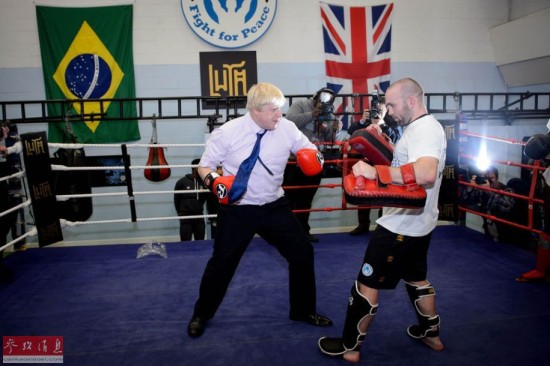 2014年10月28日,在英国伦敦,伦敦市长鲍里斯·约翰逊在他访问为和平而战拳击学院时与拳击训练手对战。为和平而战拳击学院以拳击和武术相结合的教育方式,意在发展拳击运动,提升青年人应对自身可能潜在的犯罪和暴力的能力。