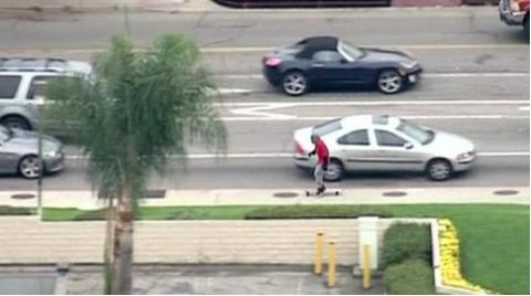中新网12月4日电 据外媒报道,日前,一名劫匪在洛杉矶街头抢劫了一辆宝马车,随后开车逃亡。但在与警察的追逐中撞车,随后他竟拎着滑板下车,试图以此来躲避警察。