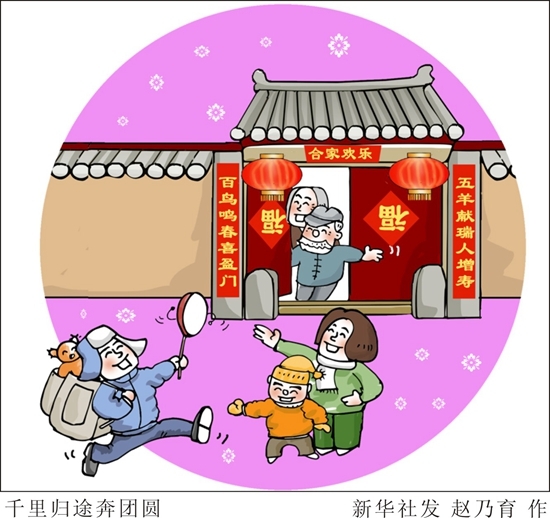 春节,“团聚”是永恒的主题。从南到北,从东到西,无论你从事何种职业,无论你身在哪里,总有一份对家的惦念,总有一种对团圆的渴望。这种浓浓的感情与亲情相关,是亿万中国人心中魂牵梦绕的中国式幸福。新华社发 赵乃育 作
