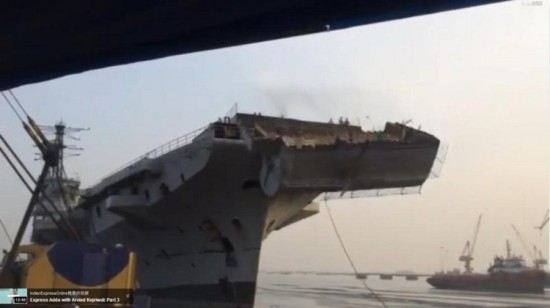 图为被扯下舰艏滑跃甲板部分的“维克兰特”号航母。