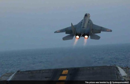 印度米格29K舰载机在航母上进行起降训练。